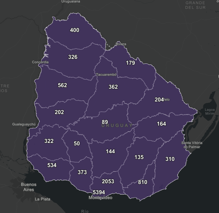 De los 777 nuevos casos, 336 son de Montevideo, 102 de Canelones, 51 de Maldonado, 47 de Artigas, 35 de Paysandú, 27 de San José, 26 de Colonia, 25 de Río Negro, 23 de Tacuarembó, 21 de Rocha, 14 de Cerro Largo, 14 de Florida, 14 de Soriano, 12 de Rivera, 11 de Salto, 11 de Treinta y Tres, 4 de Lavalleja y 4 de Durazno.