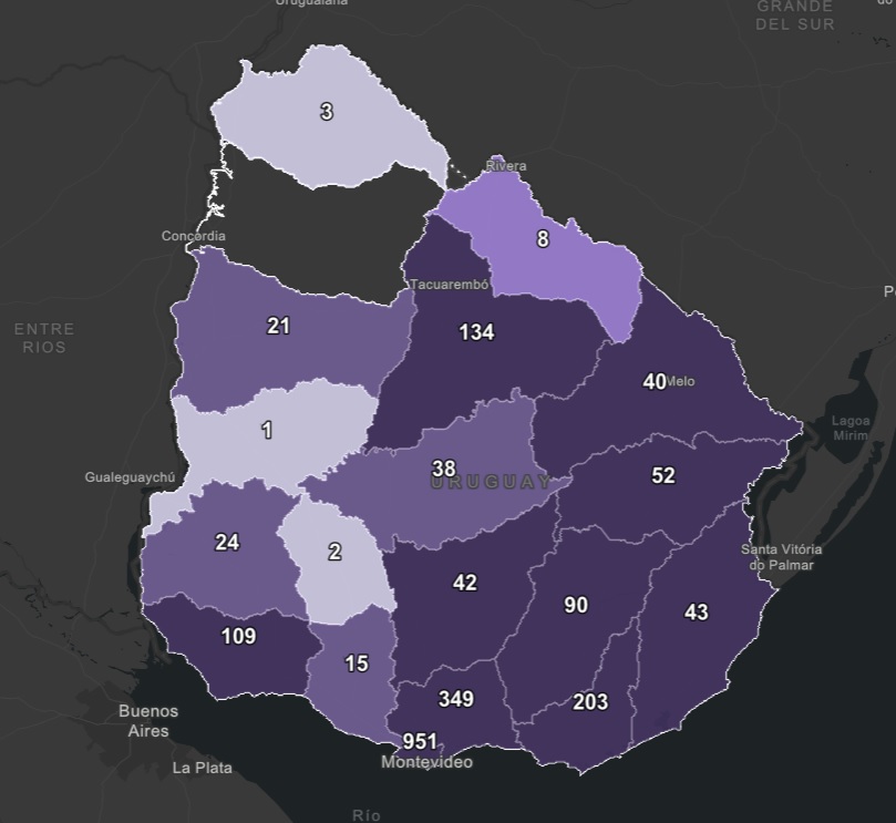 Al día de hoy todos los departamentos registran casos activos excepto Salto.