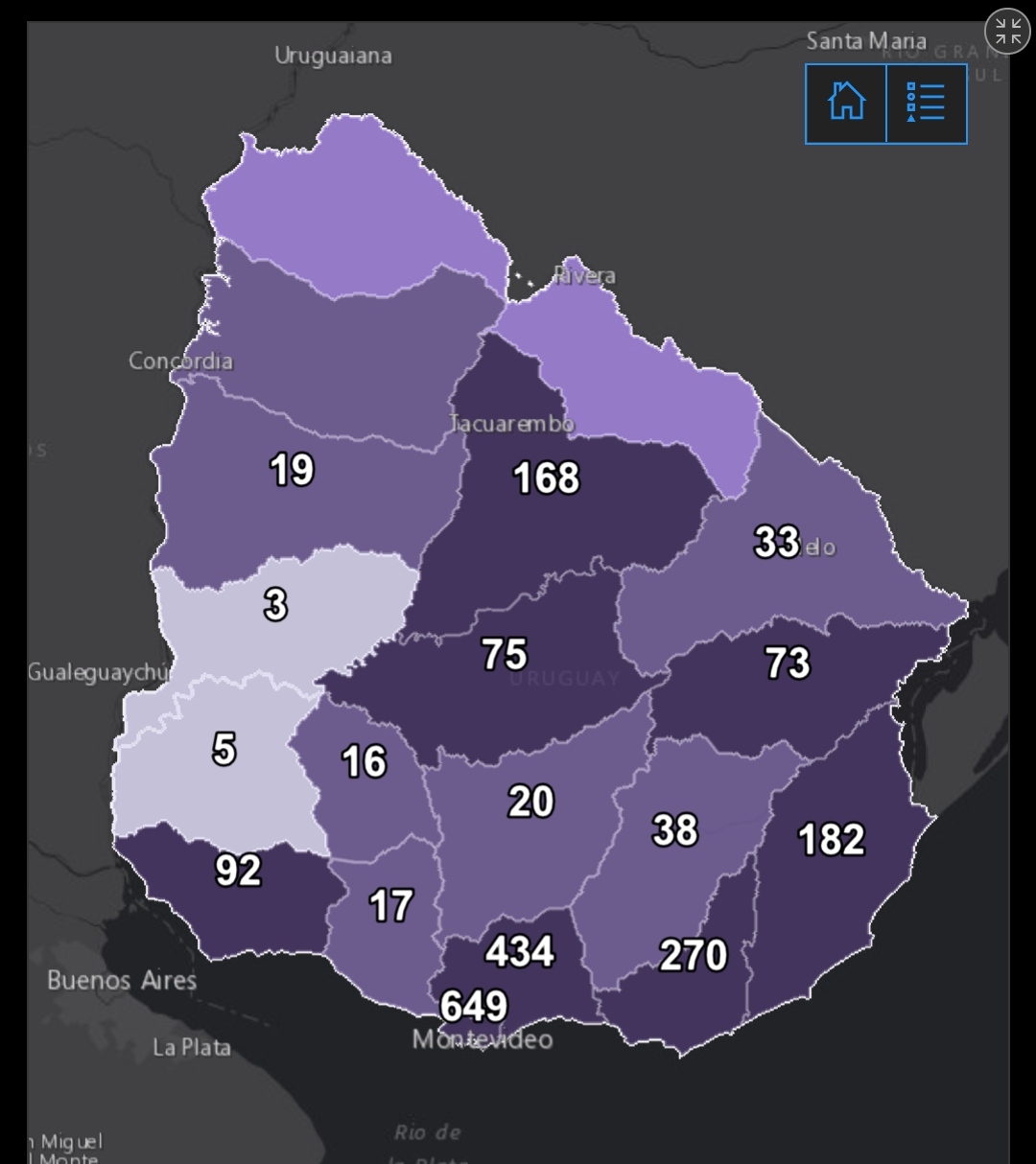 De los 169 nuevos casos, son 64 de Montevideo, 29 de Canelones, 27 de Maldonado,13 de Colonia, 8 de Rocha, 7 de Durazno, 7 de Tacuarembó, 7 de Treinta y Tres, 2 de Lavalleja, 2 de Salto, 1 de Florida, 1 de Río Negro y 1 de Rivera.