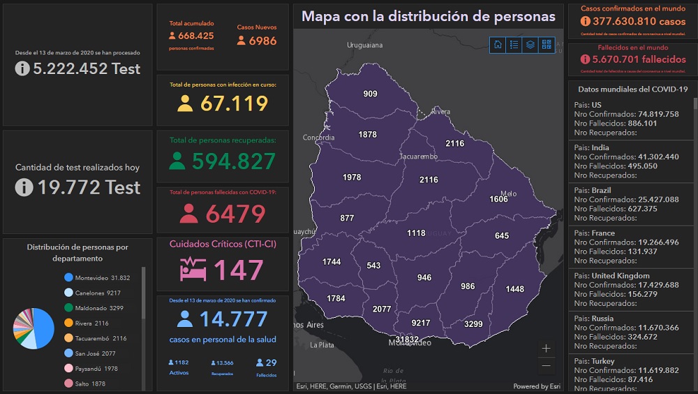 De los 6.986 casos nuevos, 3.344 son de Montevideo, 984 de Canelones, 379 de Paysandú, 329 de Maldonado, 195 de San José, 188 de Colonia, 174 de Salto, 163 de Río Negro, 159 de Lavalleja, 153 de Rivera, 142 de Rocha, 139 de Soriano, 139 de Tacuarembó, 113 de Artigas, 96 de Treinta y Tres, 85 de Florida, 82 de Durazno, 57 de Cerro Largo y 65 de Flores.
