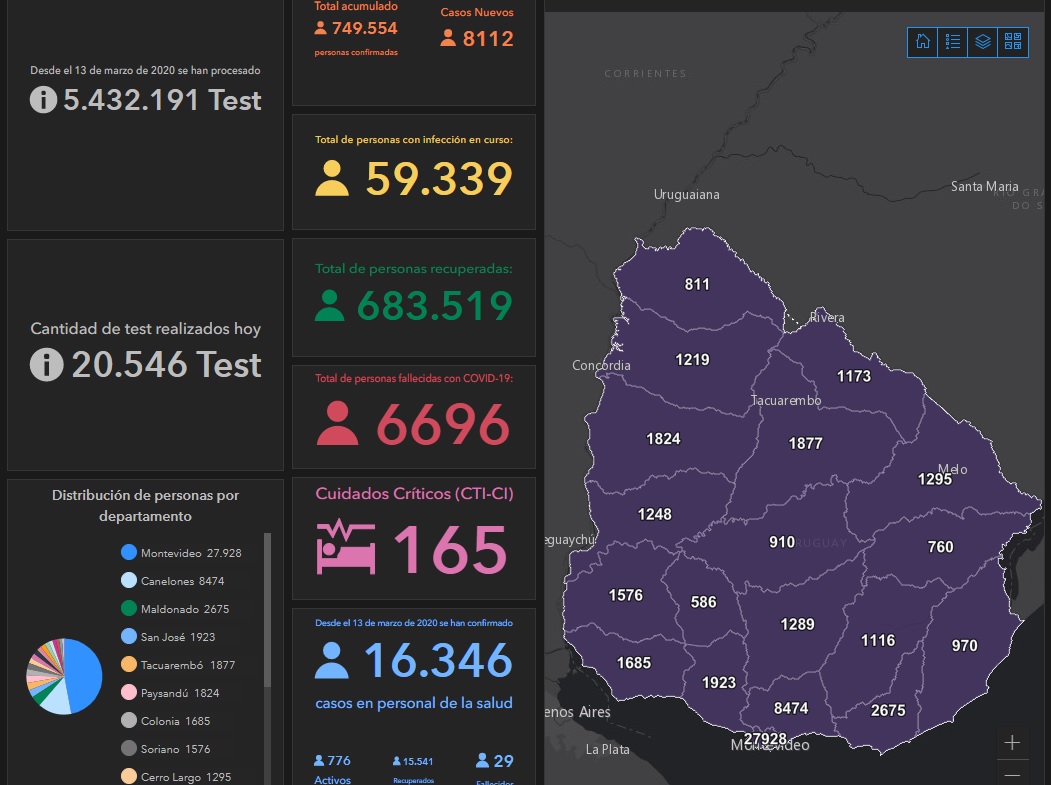 De los 8.112 nuevos casos, 3907 son de Montevideo, 1124 de Canelones, 344 de Colonia, 331 de Maldonado, 295 de Tacuarembó, 276 de Paysandú, 257 de San José, 208 de Florida, 171 de Soriano, 169 de Río Negro, 157 de Salto, 155 de Cerro Largo, 149 de Lavalleja, 145 de Rivera, 121 de Rocha, 117 de Artigas, 75 de Treinta y Tres, 67 de Flores y 44 de Durazno.