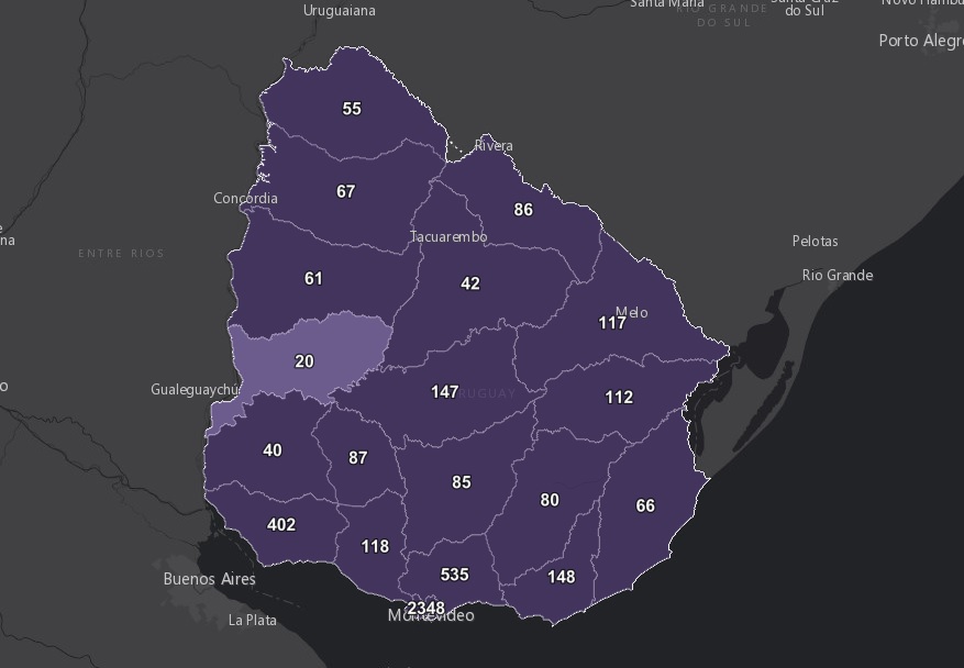 De los 820 nuevos casos, 371 son de Montevideo, 91 de Canelones, 46 de Florida, 43 de Durazno, 43 de San José, 39 de Colonia, 31 de Maldonado, 27 de Flores, 26 de Salto, 18 de Lavalleja, 17 de Rocha, 16 de Treinta y Tres, 14 de Rivera, 12 de Cerro Largo, 11 de Tacuarembó, 6 de Soriano, 4 de Artigas, 4 de Paysandú y 1 de Río Negro.
