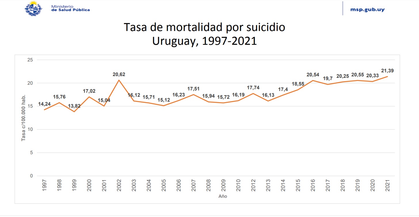 En 2016 la tasa de suicidios se situó por primera vez cercana a lo que fue en 2002, 20,54 y 20,62 respectivamente, y a partir de ese año fue oscilando dentro de ese margen hasta llegar a la tasa preliminar de 21,4 en 2021. En 2021, según datos preliminares, en Uruguay fallecieron por esta causa 758 personas, lo que corresponde a una tasa de 21,4.