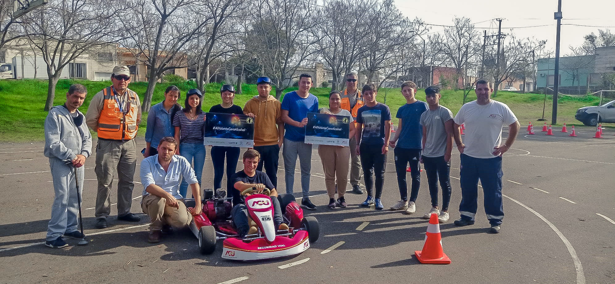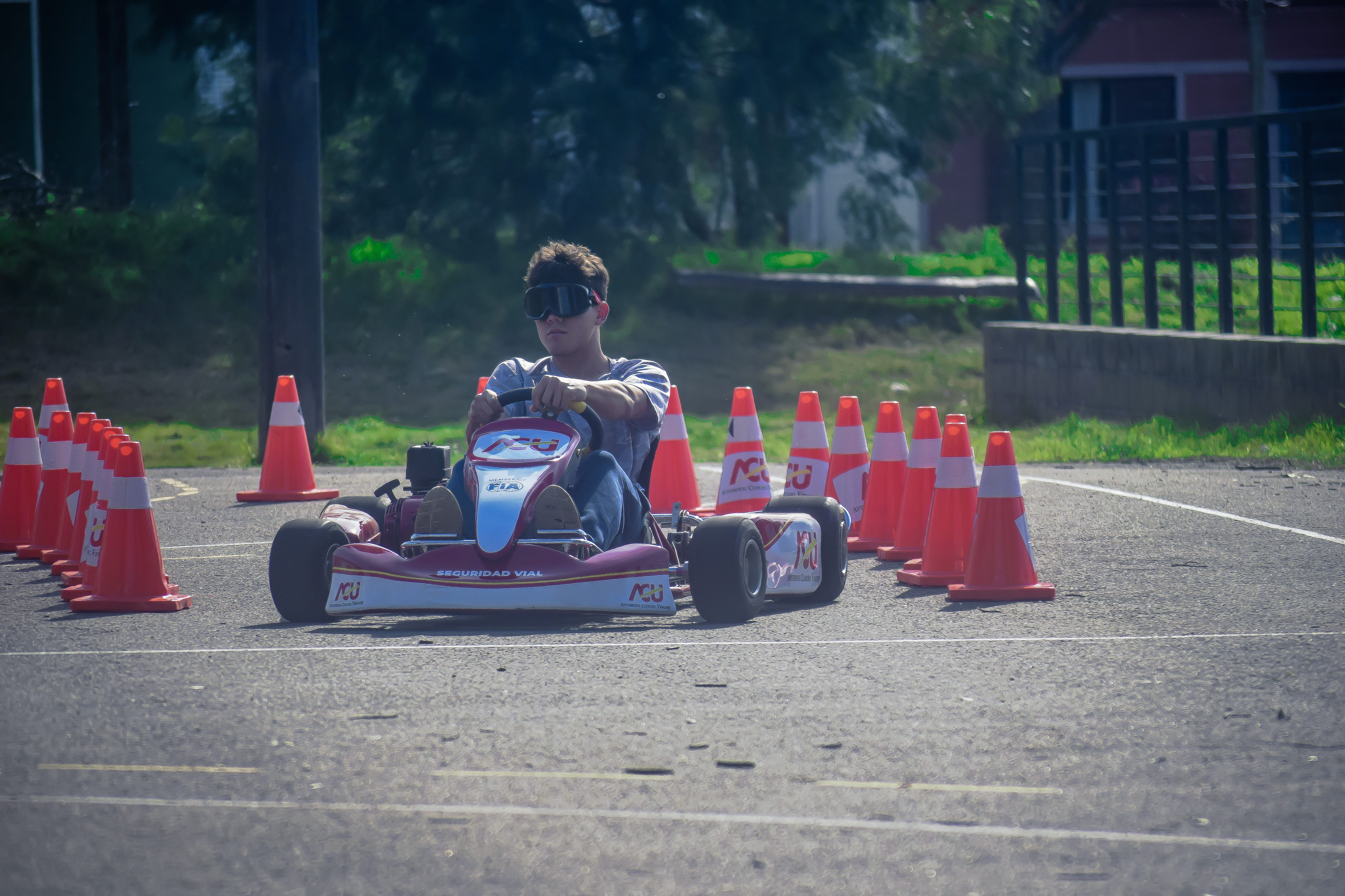 Para finalizar, se realizaron ejercicios prácticos comparativos de conducción con un kart a velocidad topeada. Primero, los jóvenes condujeron el kart por un circuito diseñado por ACU, pudiendo completar esta actividad sin mayores dificultades. Seguidamente realizaron el mismo circuito utilizando lentes que simulan el efecto que tiene el alcohol en el cuerpo humano, percibiendo las diferencias entre una y otra instancia, en cuanto a la pérdida del sentido de las referencias y las distancias, lo cual dificultaba la conducción.