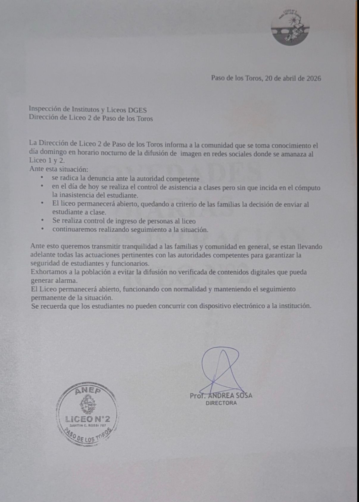 La Dirección de Liceo 2 de Paso de los Toros informa a la comunidad que se toma conocimiento el día domingo en horario nocturno de la difusión de imagen en redes sociales donde se amanaza al Liceo 1 y 2.