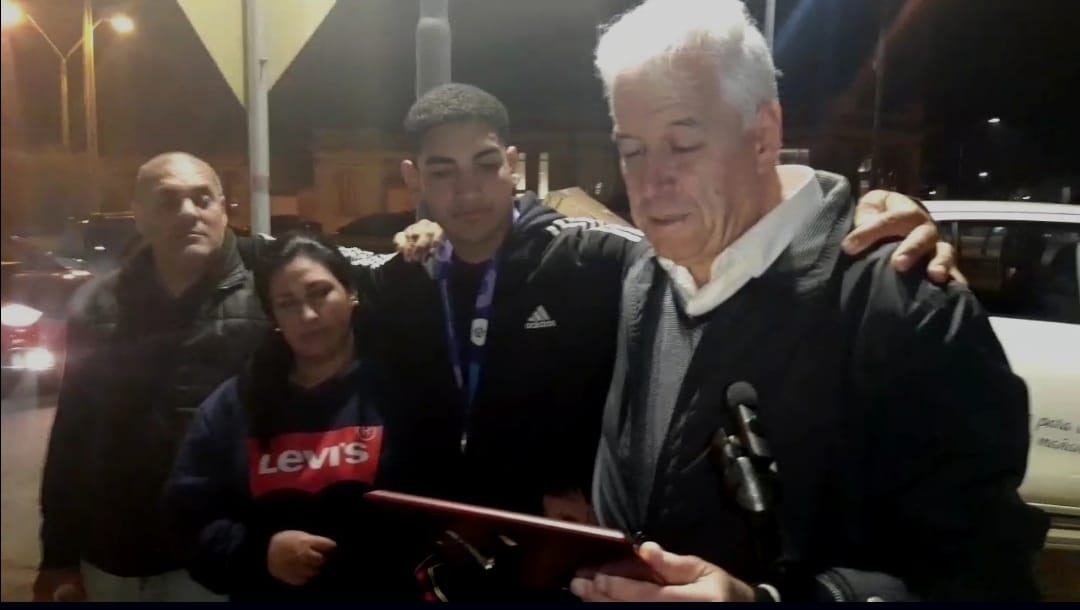 En Plaza Artigas, el Alcalde Luis Irigoin les dio la bienvenida, les manifestó el orgullo de que hayan representado a nuestro país, y le hizo entrega a un emocionado Axel, de una plaqueta en reconocimiento a su esfuerzo.