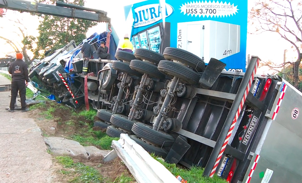 Volcó camión con celulosa luego de ataque con pidra al ingreso a Montevideo
