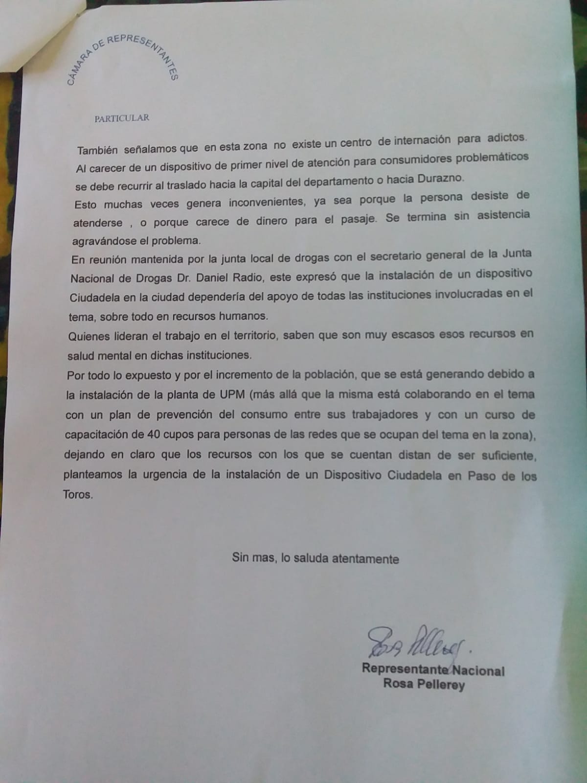 Durante el ejercicio del cargo como diputada del Frente Amplio representando al departamento de Tacuarembó, Rosa Pellerey, presentó una exposición escrita dirigida al Ministerio de Salud Pública, donde expresa preocupación por el consumo problemático de drogas en Paso de los Toros y la necesidad de contar con un Dispositivo Ciudadela que pueda atender dicha problemática.