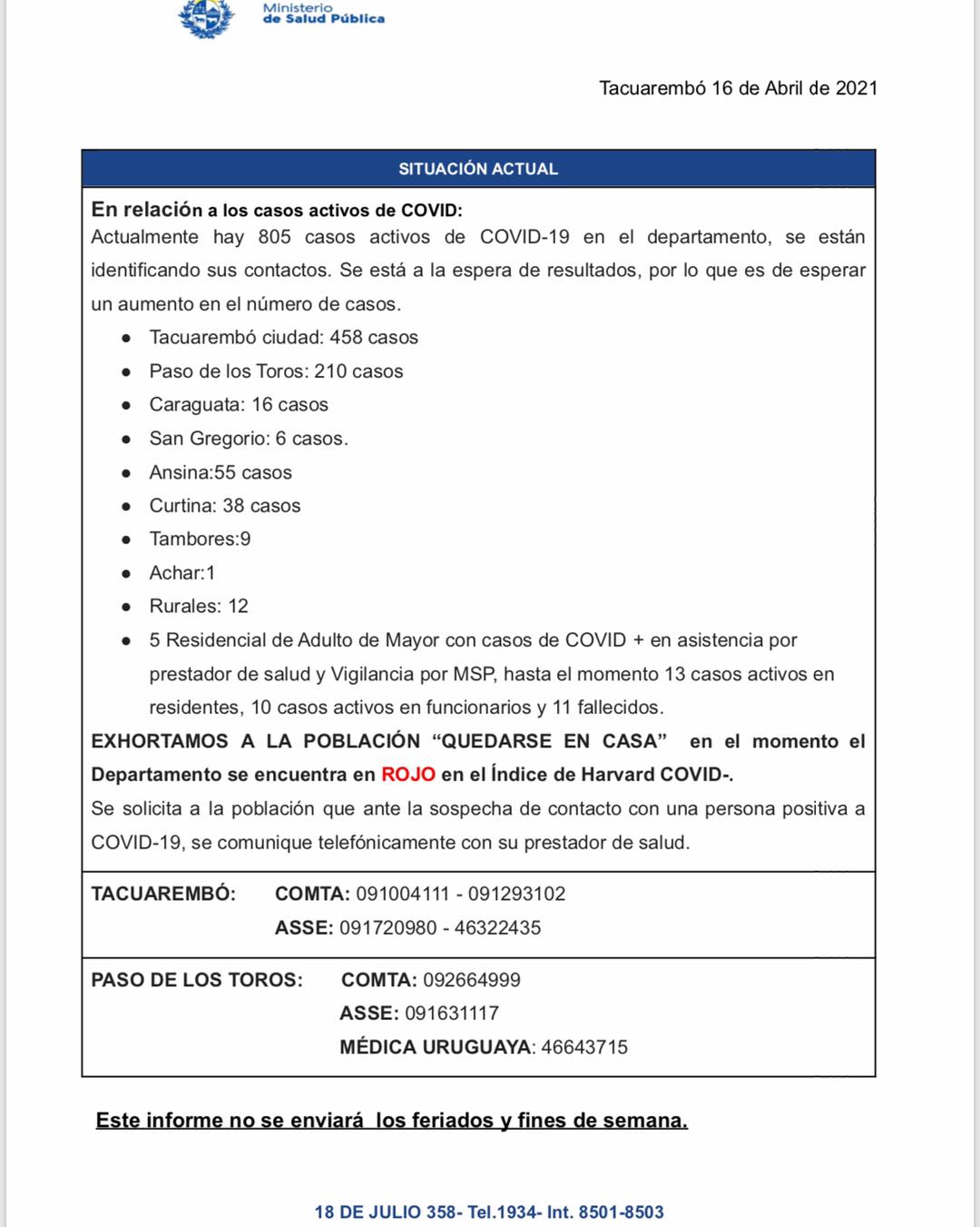 El departamento de Tacuarembó llegó a los 805 en la noche del jueves segun el reporte del SINAE, esta mañana la Departamental de Salud del MSP diò a conocer informe con la distrución de los casos en el departamento.