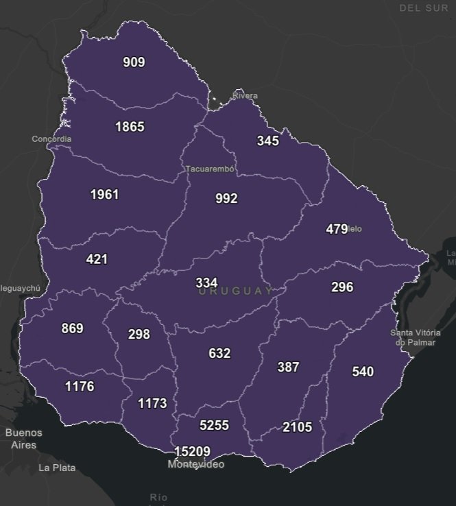 De los 3.484 casos nuevos, 1.470 son de Montevideo, 518 de Canelones, 234 de Paysandú, 214 de Salto, 207 de Maldonado, 119 de Colonia, 97 de Florida, 89 de Tacuarembó, 87 de Artigas, 79 de San José, 77 de Soriano, 70 de Rocha, 58 de Río Negro, 40 de Lavalleja, 30 de Rivera, 26 de Cerro Largo, 26 de Treinta y Tres, 22 de Durazno y 21 de Flores.