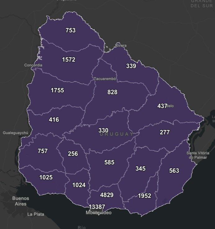 De los 2.924 casos nuevos, 1.314 son de Montevideo, 365 de Canelones, 175 de Salto, 147 de Paysandú, 146 de Maldonado, 124 de Colonia, 85 de Artigas, 81 de Rocha, 78 de San José, 70 de Soriano, 65 de Tacuarembó, 57 de Cerro Largo, 37 de Florida, 34 de Río Negro, 34 de Rivera, 33 de Lavalleja, 31 de Durazno, 27 de Treinta y Tres, y 21 de Flores.