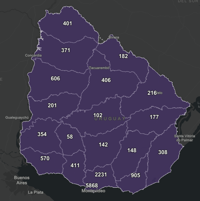 De los 839 nuevos casos, 344 son de Montevideo, 125 de Canelones, 90 de Maldonado, 46 de Rocha, 33 de Colonia, 29 de Paysandú, 28 de Soriano, 23 de San José, 23 de Tacuarembó, 19 de Artigas, 16 de Salto, 15 de Cerro Largo, 10 de Treinta y Tres, 9 de Lavalleja, 8 de Río Negro, 7 de Durazno, 5 de Florida, 5 de Rivera y 4 de Flores.