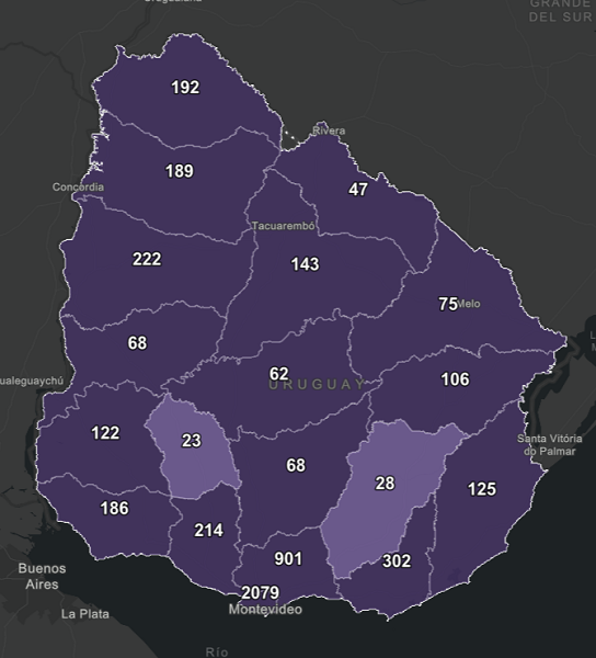 De los 452 nuevos casos, 212 son de Montevideo, 70 de Canelones, 25 de Maldonado, 23 de Salto, 18 de San José, 15 de Tacuarembó, 14 de Florida, 14 de Paysandú, 12 de Colonia, 8 de Artigas, 8 de Durazno, 8 de Rocha, 8 de Treinta y Tres, 6 de Río Negro, 5 de Cerro Largo, 2 de Rivera, 2 de Soriano, 1 de Flores y 1 de Lavalleja.