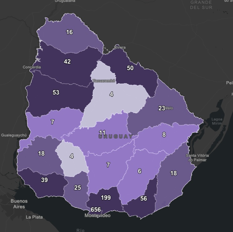 De los 79 nuevos casos, 35 son de Montevideo, 14 de Canelones, 8 de Colonia, 5 de Salto, 4 de Rivera, 3 de Maldonado, 3 de Soriano, 2 de Durazno, 2 de Rocha, 1 de Paysandú, 1 de Tacuarembó y 1 de Treinta y Tres.