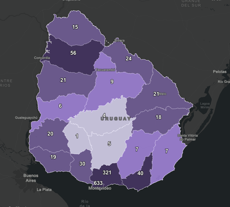 De los 189 nuevos casos, 99 son de Montevideo, 51 de Canelones, 8 de Cerro Largo, 7 de Maldonado, 7 de Salto, 5 de Treinta y Tres, 2 de Artigas, 2 de Colonia, 2 de Rivera, 2 de San José, 1 de Florida, 1 de Lavalleja, 1 de Paysandú y 1 de Soriano.