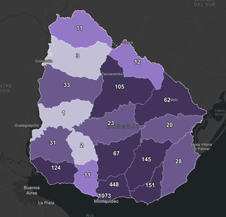 De los 195 nuevos casos, 109 son de Montevideo, 26 de Canelones, 19 de Maldonado, 13 de Colonia, 6 de Lavalleja, 6 de Rocha, 5 de Tacuarembó, 3 de Cerro Largo, 3 de Soriano, 2 de Florida, 2 de Paysandú y 1 Treinta y Tres.