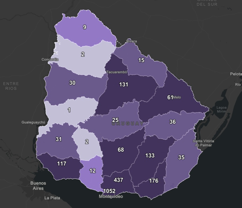 De los 235 nuevos casos, 93 son de Montevideo, 46 de Canelones, 24 de Maldonado, 19 de Tacuarembó, 15 de Treinta y Tres, 10 de Colonia, 9 de Lavalleja, 9 de Rocha, 3 de Florida, 3 de Soriano, 2 de Paysandú, 1 de Rivera y 1 de Salto.