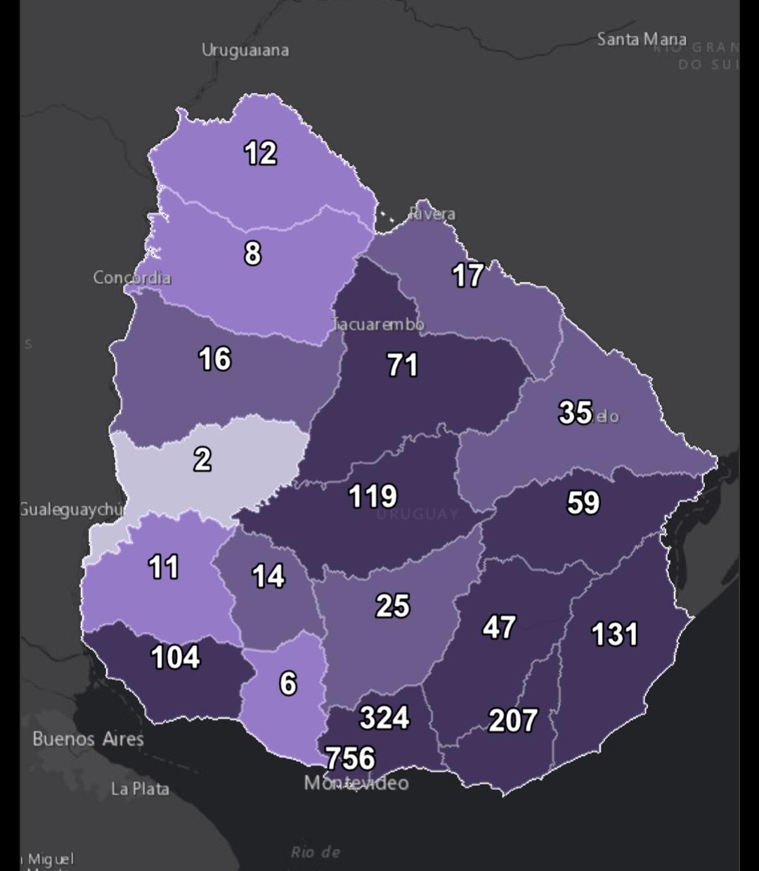 De los 178 nuevos casos, 63 son de Montevideo, 25 de Canelones, 25 de Maldonado, 25 de Rocha, 11 de Durazno, 5 de Flores, 4 de Lavalleja, 4 de Tacuarembó, 3 de Artigas, 3 de Colonia, 2 de Florida, 2 de Paysandú, 2 de Salto, 1 de Cerro Largo, 1 de Rivera, 1 de Soriano y 1 de Treinta y Tres.
