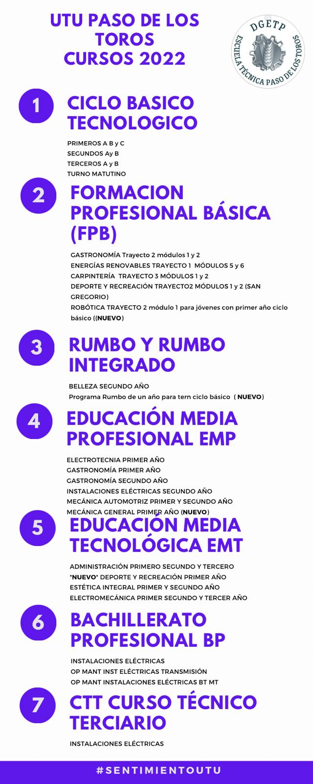 UTU Paso de los Toros dentro de la propuesta educativa del año 2022 ofrecerá Educación Media Tecnológica Deporte y Recreación. Inicio pre-inscripciones tambien para Mecanica General y programa Rumbo para mayores de 18 años interesados en realizar el Ciclo Bàsico en un año.