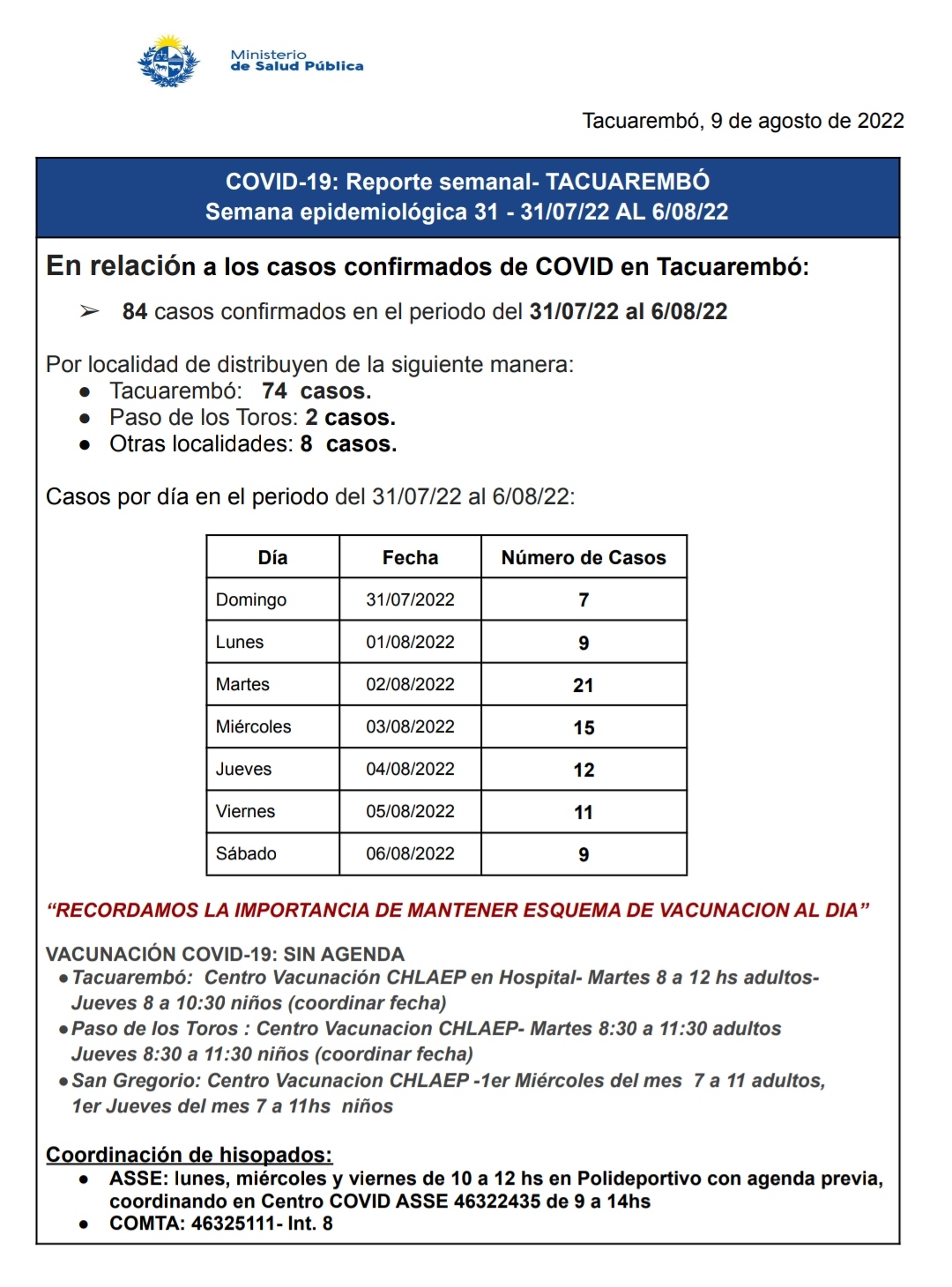 Departamental de Salud del MSP dió a conocer informe semanal de casos Covid 19 activos en el departamento.
