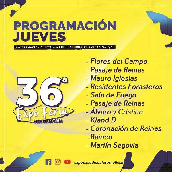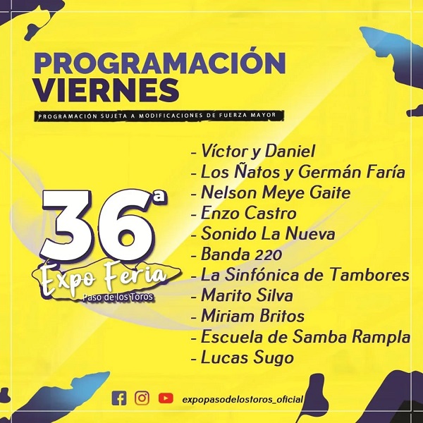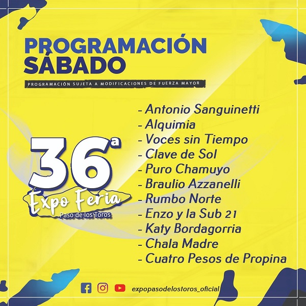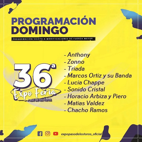 Programación 36a Expo Feria de Paso de los Toros para los día jueves 7, viernes 8, sábado 9 y domingo 10 de abril. Parque Batlle y Ordoñez de Paso de los Toros. Entrada Libre y Gratuita.
