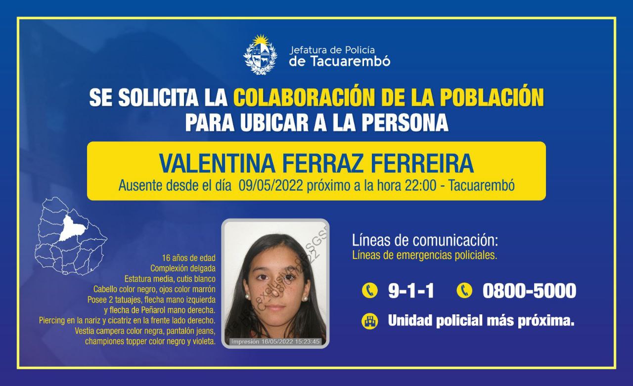 La Jefatura de Policía continúa trabajando en procura de solicita ubicar a VALENTINA FERRAZ FERREIRA ausente desde el pasado 9 de mayo de su domicilio en la ciudad de Tacurembó.